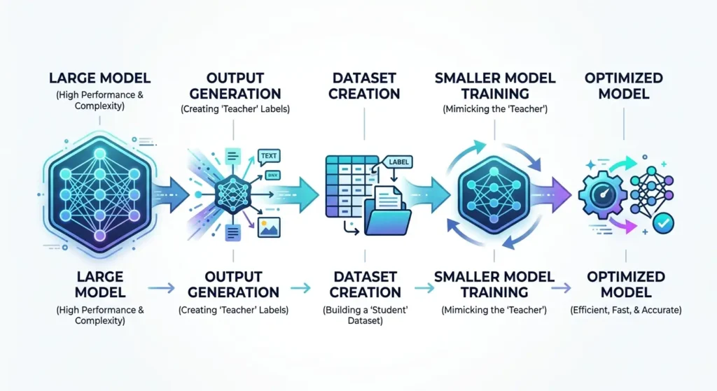 - A smaller model (called the student) learns by observing the teacher’s outputs
